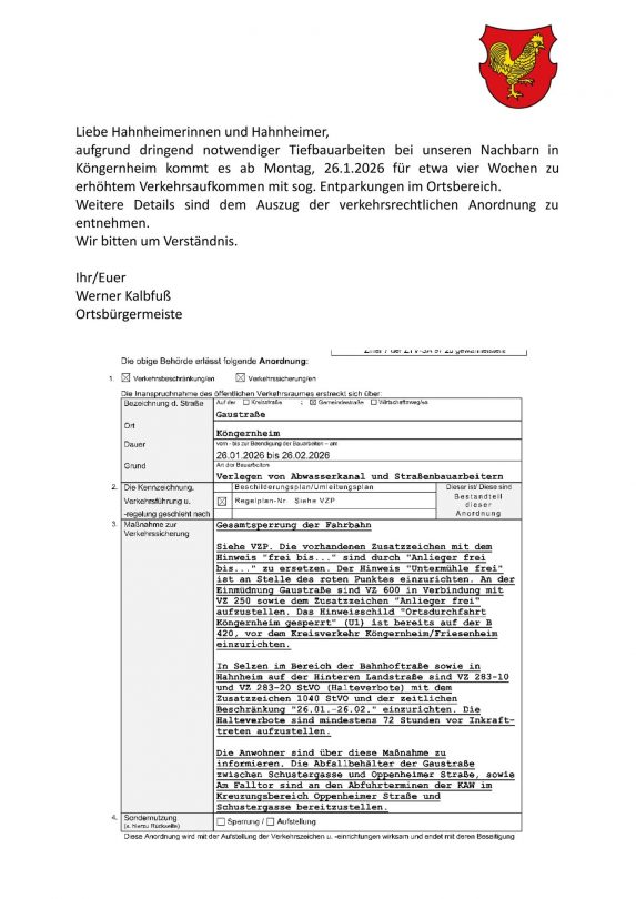 Umleitung durch Hahnheim ab Montag den 26.1.2026 !